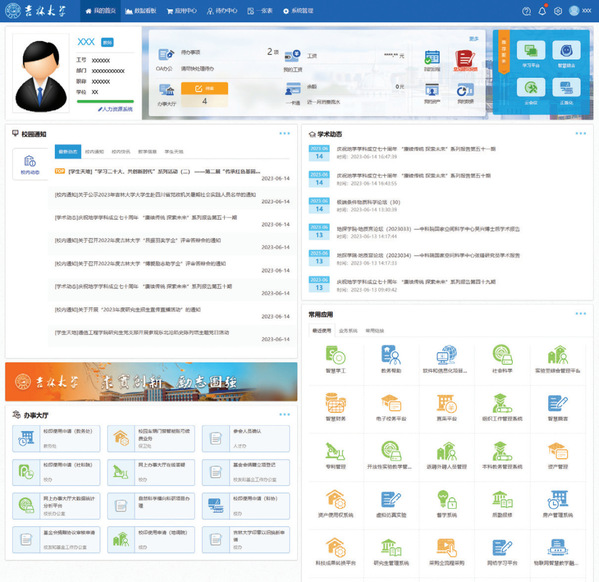 通过融合门户,全校师生可直接跳转进入人力资源系统、教务教学管理系统、组织工作管理系统、财务系统、社会科学研究院科研管理系统、学工系统、云会议、科研院横向项目管理系统等56个业务应用,如图3所示。平台彻底改变了以往学校应用分散、多套用户密码的状况,使之以一种融合的方式呈现于师生面前,也提高了师生业务办理的效率。