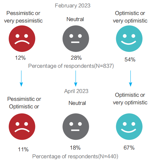 实际上,高等教育数字化领域一直在关注人工智能对教育带来的变化。EDUCAUSE相关调研报告显示,针对“我们对生成式人工智能的感觉如何”这一问题,2023年2月,54%的受访者(高教社区人员等)表示对生成式人工智能的态度是“乐观”或“非常乐观”;2023年4月,短短两月,这一数据猛然上升至67%(如图1所示)。可知高等教育领域,人们对生成式人工智能的态度正逐渐转变。