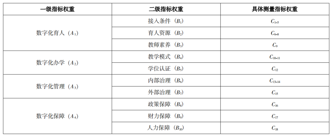 发展指数包含4个一级指标和10个二级指标以及18个具体测量指标。每一个指标都能从不同层面反映高等教育数字化发展水平,但它们在高等教育数字化发展指数中的权重并不相同,因此需要对高等教育数字化发展指数的所有指标建构权重。